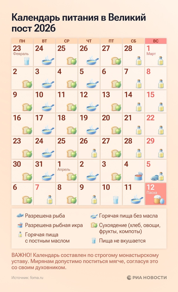 Вчера, 23 февраля, у православных христиан начался самый строгий и продолжительный период в церковном календаре — Великий пост. Он продлится семь недель и завершится 11 апреля празднованием Светлого Христова Воскресения (Пасхи). В 2026 году Великий пост продлится 48 дней. Это время духовного очищения, покаяния и единения с Богом, которое предполагает не только молитву, но и ограничения в пище. Верующие постепенно готовятся встретить главный праздник, проходя путь длиной в семь недель. Ограничения в пище: пять степеней строгости Церковный устав предусматривает разную степень воздержания в зависимости от дня недели и значимости событий. Выделяют пять основных ступеней: Полное воздержание от пищи. Самая высшая степень строгости. Ей необходимо следовать в первые дни поста (Чистый понедельник) и в самый скорбный день церковного года — Страстную пятницу (непосредств Показать полностью... 👉 Подписаться на канал