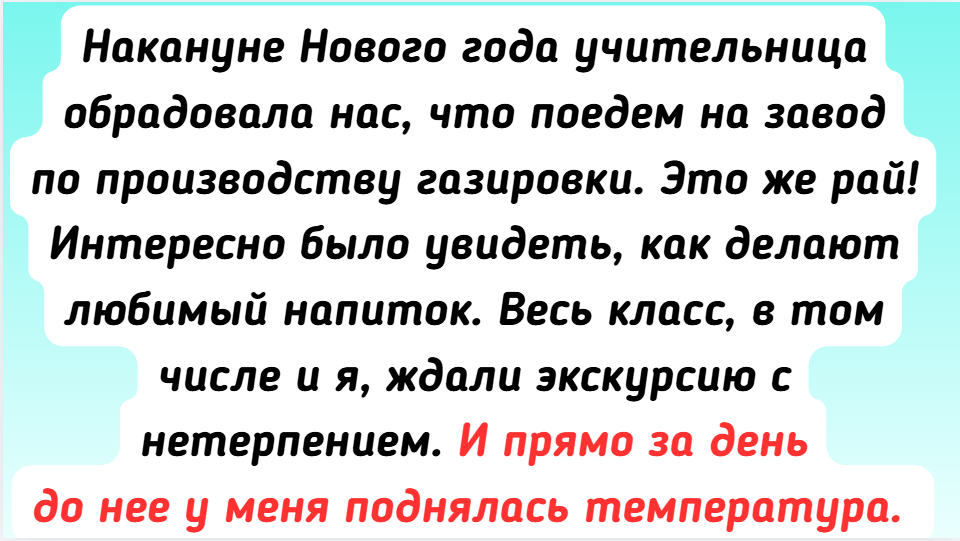 - Накануне Нового года учительница обрадовала нас, что поедем на завод по производству газировки. Это же рай! Интересно было увидеть, как делают любимый напиток. Весь класс, в том числе и я, ждали экскурсию с нетерпением. И прямо за день до нее у меня поднялась температура. Наивно надеялся на следующий день проснуться здоровым, но стало только хуже. Я, честно говоря, больше переживал за экскурсию, чем за свое состояние. Расстроился, злился на нелепое совпадение. Одноклассники съездили на экскурсию и восторженно делились со мной по телефону своими впечатлениями. Сказали, что это было лучшее, что они когда-либо видели. Но когда я выздоровел и пришел в школу, меня ждал приятный сюрприз. Классная руководительница вручила мне небольшую упаковку любимой газировки. Сказала, что знает, как я мечтал попасть туда, поэтому взяла для меня утешительный сувенир. Следующие 3 дня растягивал удовольствие, чтобы не выпить все за раз.