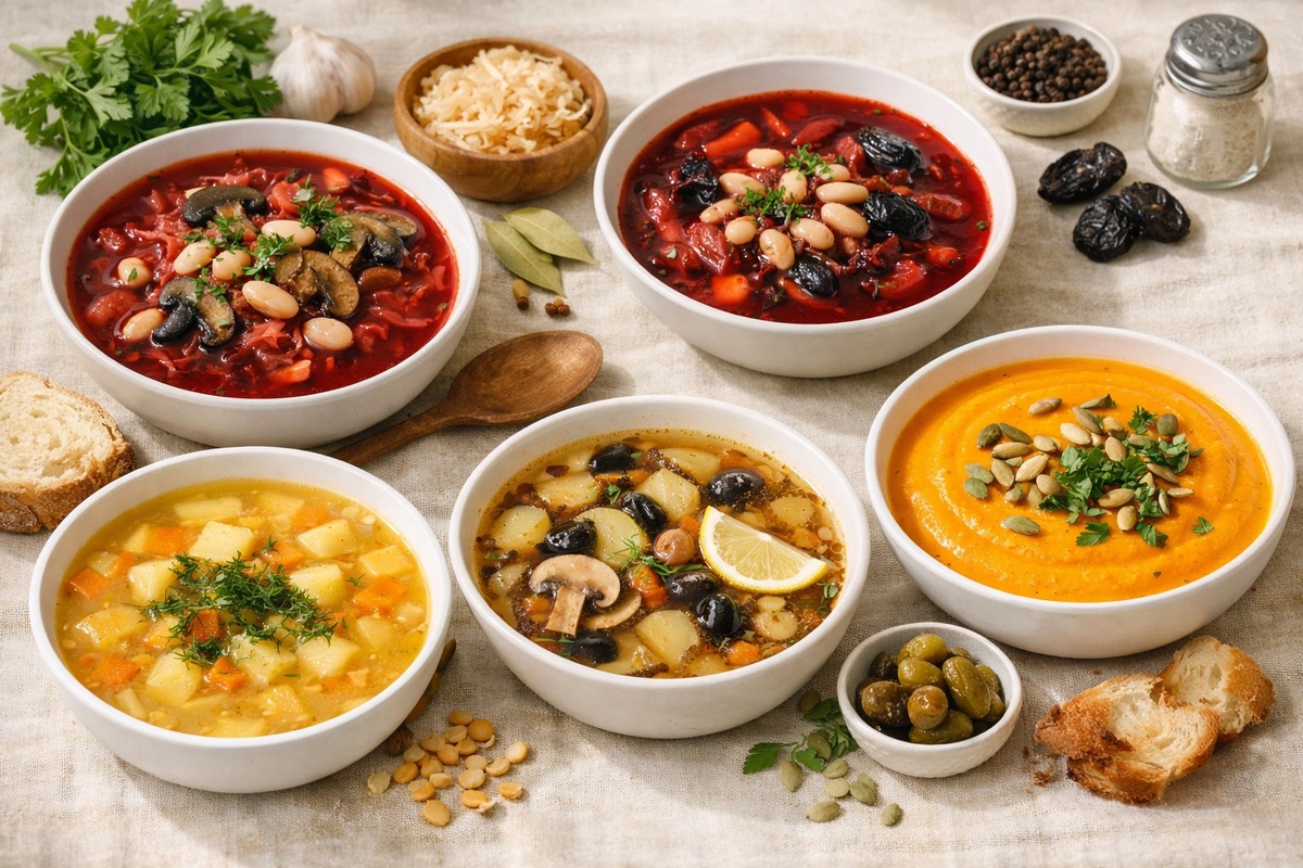 Сохраняйте подборку постных супов, которые удобно готовить на каждый день. Здесь есть и борщи, и густой гороховый, и более лёгкие овощные варианты. Можно чередовать в течение недели и не повторяться.