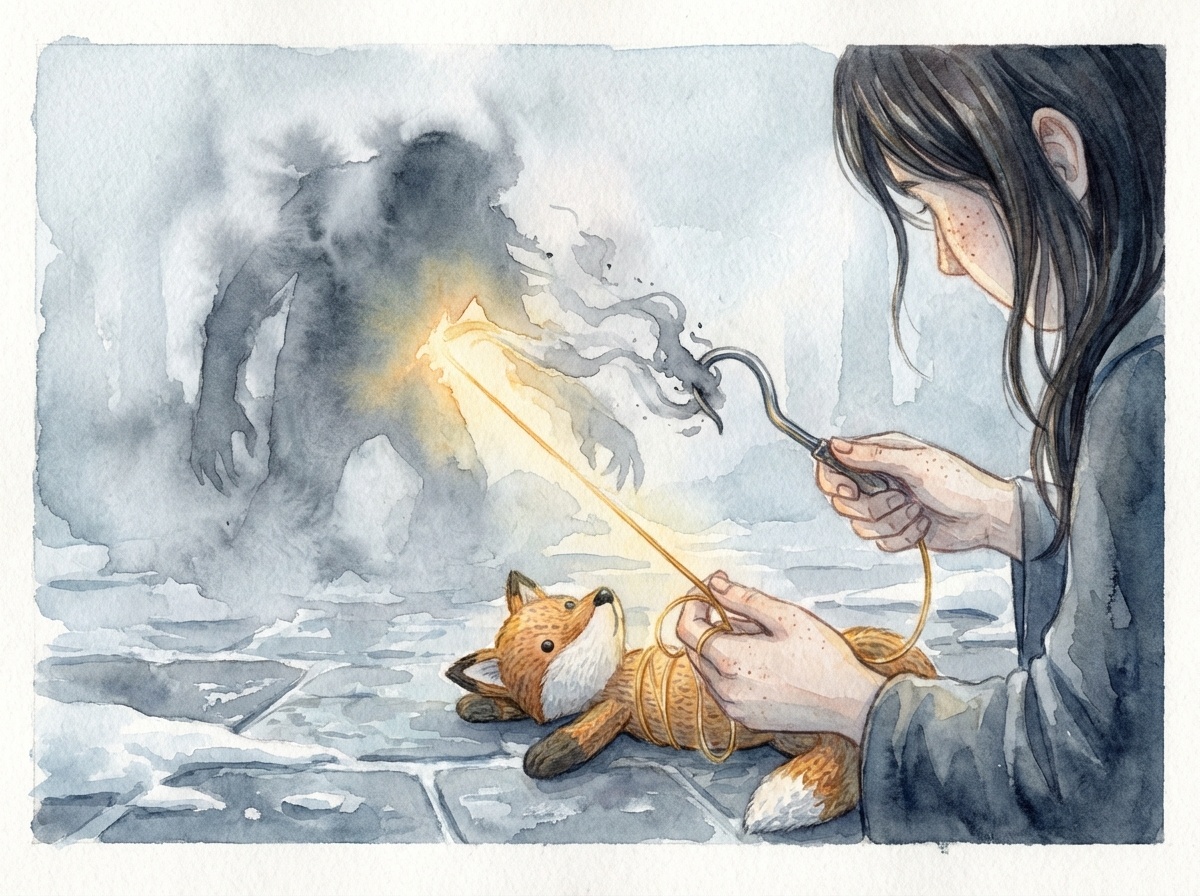 Она не стала тянуться за спицами. Вместо этого она резко дернула за нитку, торчащую из бока лиса. Игрушка начала стремительно распускаться. Петли освобождались одна за другой, превращая форму обратно в хаос. Но Натали не просто портила свою работу.