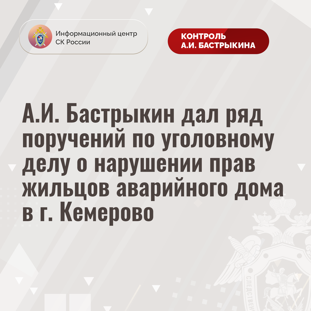 А.И. Бастрыкин дал ряд поручений по уголовному делу о нарушении прав жильцов аварийного дома в г. Кемерово В приемную Председателя СК России А.И. Бастрыкина в социальной сети «ВКонтакте» поступило обращение по вопросу несогласия с ходом установления обстоятельств нарушения прав жильцов многоквартирного дома на улице Типовой в городе Кемерово. Конструкции здания 1959 года постройки разрушаются, физический износ превышает 75%, из-за чего в 2018 году оно признано аварийным. В июле 2024 года судом на компетентные органы возложена обязанность сократить срок расселения, установленный на 2028 год, и предоставить гражданам благоустроенное жилье до конца июня 2025 года. Однако, несмотря на угрозу обрушения строения, до настоящего времени решение не исполнено. Обращения в различные инстанции результатов не принесли, никто к ответственности не привлечен. В СУ СК России по Кемеровской области – Кузбассу по данному факту расследуется уголовное дело, по которому ранее А.И. Бастрыкин поручал предста