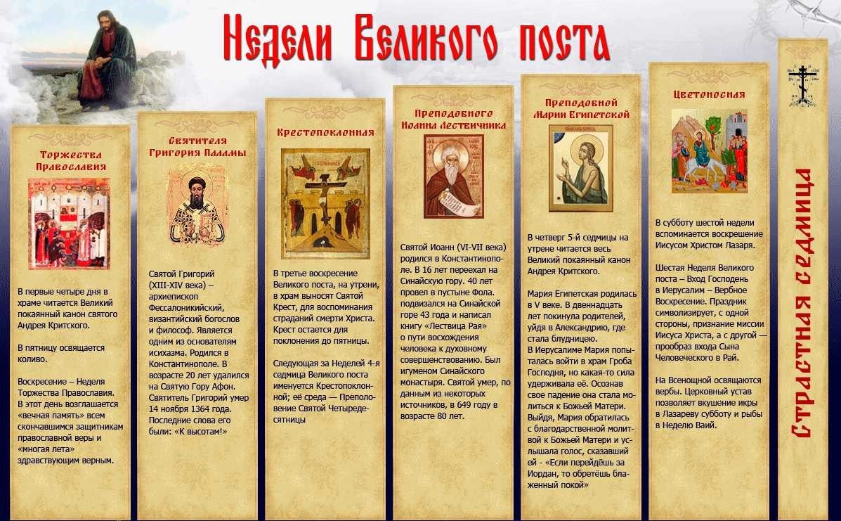 Вступая в Великий пост, мы подражаем Господу Иисусу Христу, 40 дней постившемуся в пустыне. Каждая неделя поста посвящена значимому для Церкви событию или подвижнику, труды которого учат нас важному в духовной жизни. Когда мы следуем этим примерам с чистым сердцем и всем возможным усердием, то восходим по ступеням духовной жизни, приближаясь к Богу. ПОМИНОВЕНИЕ О ЗДРАВИИ ВО ДНИ ПОСТА Неделя* Торжества Православия В этот день Церковь празднует окончательную победу над иконоборчеством – ересью, отрицавшей почитание святых икон. После столетней борьбы, в 843 году по инициативе императрицы Феодоры почитание святых образов было восстановлено. В первое воскресенье Великого поста патриарх Мефодий, духовенство и народ с иконами в руках прошли крестным ходом по Константинополю, что и вспоминается в этот день как торжество истинной веры. Неделя святителя Григория Паламы Память святого Григория Паламы, защитившего учение о том, что человек может познавать Бога уже в земной жизни через Его нетвар
