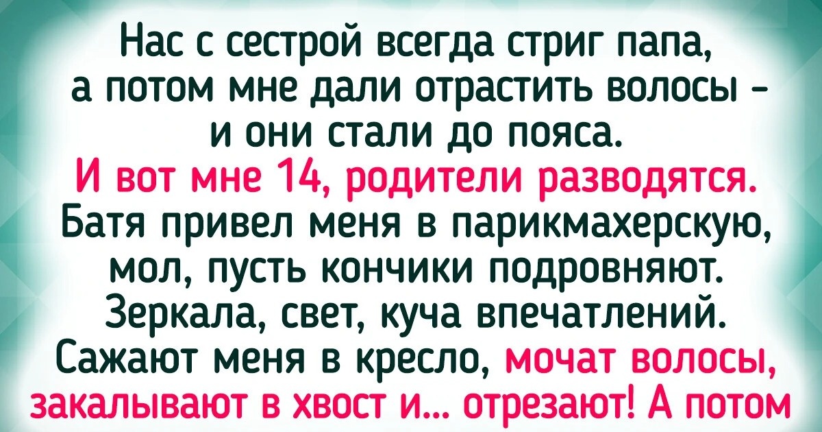 Нас с сестрой всегда стриг папа, а потом мне дали отрастить волосы — и они стали до пояса. И вот мне 14, родители разводятся. Батя привел меня в парикмахерскую, мол, пусть кончики подровняют. Зеркала, свет, куча впечатлений. Сажают меня в кресло, мочат волосы, закалывают в хвост и... отрезают! А потом заворачивают мой хвост в газетку и отдают мне. Зачем отец это сделал? Думаю, решил в глазах мамы «забрать свое», ведь это он когда-то разрешил мне отращивать волосы. Я не могла тогда в зеркало на себя смотреть, такой стресс был. Как я хвост оплакивала! Потом мама просто подарила его соседке на шиньон. Как вспомню, так радуюсь, что уже взрослая и могу теперь постоять за свое мнение и свои вещи. © MestVrednaya / Pikabu