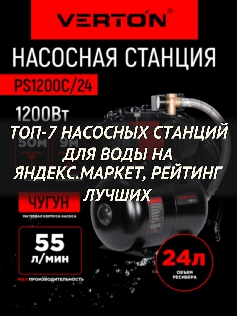 7. ⭐ Насосная станция Verton AQUA PS1200C/24 (1200Вт, 55л/мин, 24л, гл. 9м, h 50м, вых. 1", 3 бар)