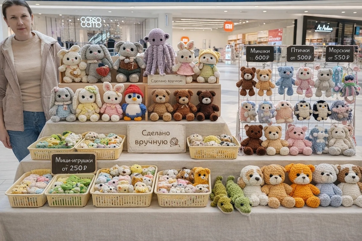 Привет, мои хорошие! На ярмарке коллега предложила загрузить мой стол в гига чат и посмотреть, что он сгенерирует. Было утро, я только выставляла игрушки. Меня со столом сфоткали. И ИИ нашаманил))) Вот что получилось))) Половину игрушек не узнаю))) Все ИИ переделал, где-то в лучшую сторону, где-то не очень. Идея со ступенькой спереди мне понравилась, надо только придумать, из чего её соорудить. И сама давно хочу скатерть, по типу мелкой мешковины цвета сгущёнки. А ценники! Выше всяких похвал. Все так аккуратненько! Вот и думай, что лучше: аккуратный стол с небольшим количеством игрушек, и много повторов в запасе (пополнять по мере продаж). Или большой ассортимент, и все завешено, заставлено до последнего сантиметрика? Оригинал стола прилагаю ниже (в процессе расстановки). Идей много! Главное, дойти до их воплощения)))!!! Всем мира и добра!