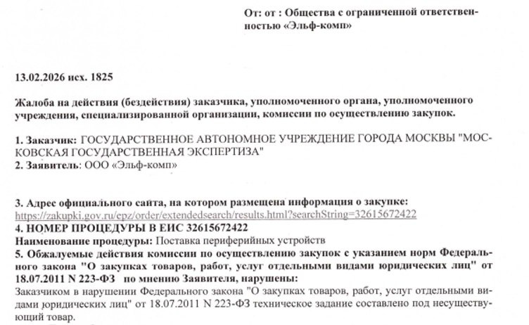 В Московское УФАС поступила жалоба от компании «Эльф-комп» на действия Мосгосэкспертизы при проведении аукциона на право заключения договора на поставку периферийных устройств. Её рассмотрение состоится утром 26 февраля. Поводом для жалобы оказались результаты определения поставщика в тендере на поставку твердотельных накопителей (SSD). Цена контракта составляет 14,7 млн рублей. RuHard ознакомился с текстом жалобы. По мнению её авторов, указанная в техзадании совокупность характеристик противоречит техническим возможностям производства твердотельных накопителей. Установление невыполнимых требований заказчиком блокирует конкуренцию и является недобросовестным, а принцип стимулирования инноваций не может трактоваться как требование поставки товара, не существующего в природе, считают представители «Эльф-комп». Справка RuHard: • ГАУ города Москвы «Московская государственная экспертиза» (Мосгорэкспертиза) зарегистрировано в 2008 году в Москве. Основной вид деятельности — экспертиза п