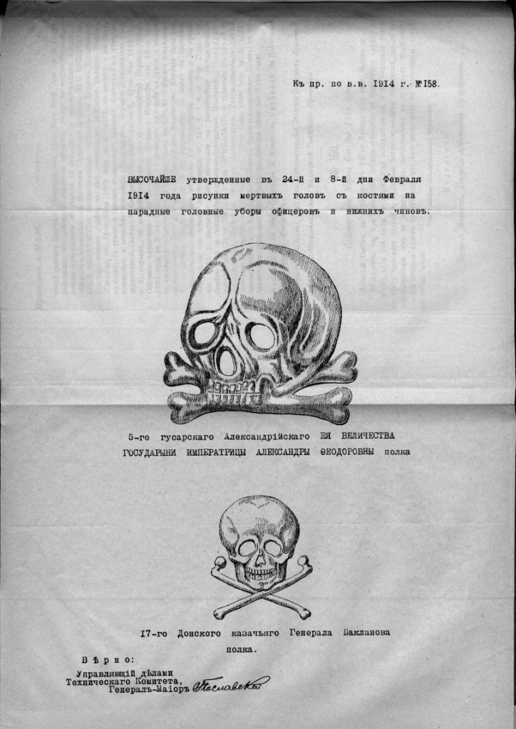 по в.в. 1914 г. № 158. ВЫСОЧАЙШЕ утвержденные въ 24-й и 8-й дни Февраля 1914 года рисунки мертвыхъ головъ съ костями на парадные головные уборы офицеровъ и нижнихъ чиновъ. ▪️5-го гусарскаго Александрійскаго ЕЯ ВЕЛИЧЕСТВА ГОСУДАРЫНИ ИМПЕРАТРИЦЫ АЛЕКСАНДРЫ ӨЕОДОРОВНЫ полка ▪️17-го Донского казачьяго Генерала Бакланова полка. Вѣрно: Управляющій дѣлами Техническаго Комитета, Генераль-Маіоръ Пославский З а м е т к и С е м и р е к а