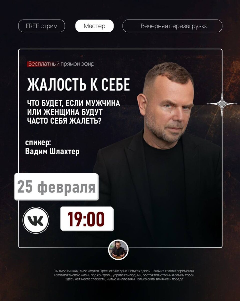 » Задавай свои вопросы по теме в комментариях к этому посту. На все отвечу в прямом эфире. ⏳ 25 февраля в 19:00 (до 30 минут) 🕙 Подключайся только Вконтакте. Я провожу «Вечернюю перезагрузку» каждую среду. Запись эфира выложу в частном канале. Обо мне | Благодарность команде | Навигация