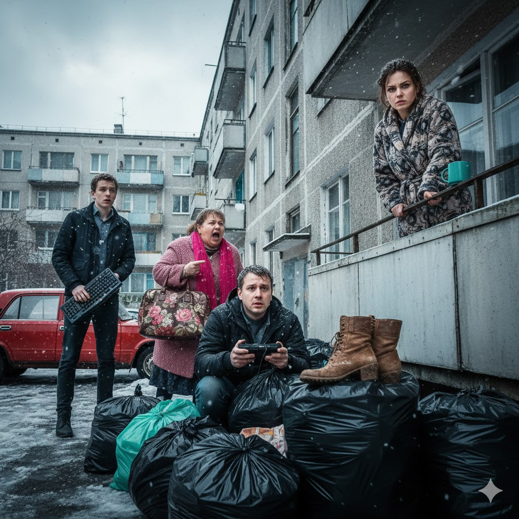 Я вышла на балкон, плотно запахнув халат. Внизу разворачивалась эпическая сцена. Антон, стоя по колено в мусорных мешках, пытался спасти свою приставку от начавшегося снега. Тамара Петровна, размахивая сумкой, орала на весь двор, обещая мне кары небесные и прокуратуру.