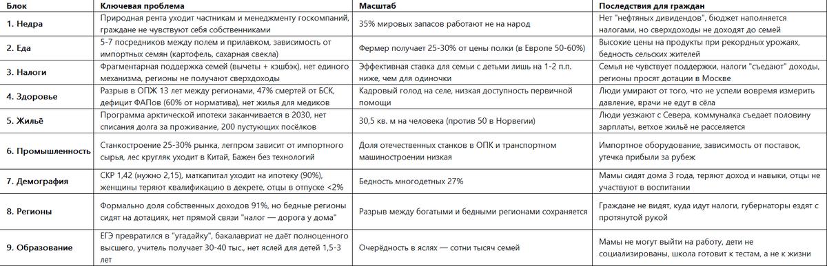 - Здоровье и образование: Пока родители работают, дети учатся у перегруженных учителей (30-40 тыс. зарплата) → качество образования падает → через 20 лет мы получаем поколение, не способное создавать новые технологии → зависимость от импорта усиливается.