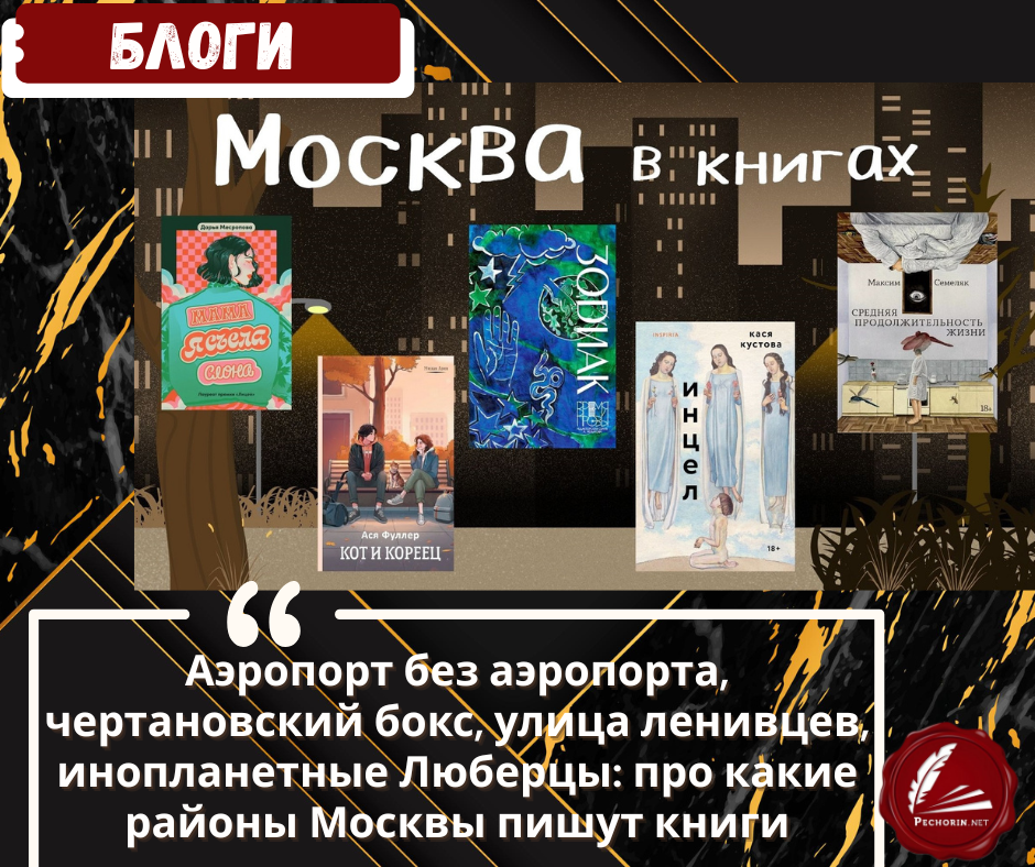 Пока одни писатели исследуют бескрайнюю Россию, другие вдохновляются колоритом разных районов столицы. В нашем обзоре представлены следующие книги, действие которых разворачивается в Москве: • «Кот и кореец», Ася Фуллер — Чертаново и школа корейского языка «Вонгван» на станции метро Аэропорт. • «Инцел», Кася Кустова — метро Аэропорт, Кузьминки. • «Средняя продолжительность жизни», Максим Семеляк — движение из точки А (метро Аэропорт) через улицы Черняховского и Часовую, подземку, Курский вокзал, электричку в пункт Н (не называемый напрямую, но очень похожий на Ногинск). • «Зодиак», книга рассказов редакторской серии Алексея Небыкова «Время прозы» — в рассказе Анны Безукладниковой «Совсем как живой» описывается Алтуфьево. • «Я обязательно уволюсь», Маша Гаврилова — Люберцы. Чистые пруды, Сокольники, Серебряный бор. • «Мама, я съела слона», Дарья Месропова — Гоголевский бульвар, Люблино и Одинцово. • «Уродины», Екатерина Янсон — от метро Юго-Западная до желтого корпуса Института иностр