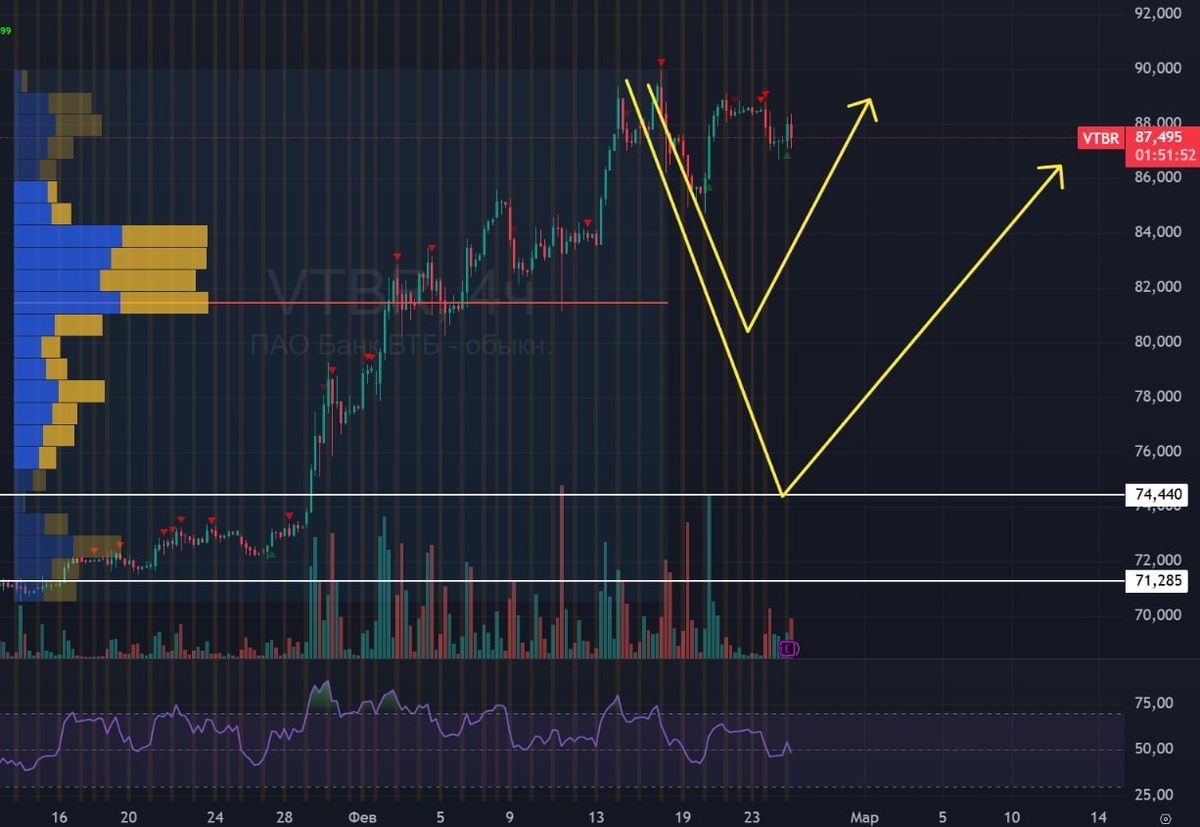 🏦 ВТБ ВТБ МСФО за 2025 г: ©️Чистые процентные доходы -11% ©️Чистые комиссионные доходы +14% ©️Резервы 200 млрд руб. против 20 млрд руб. годом ранее ©️Чистая прибыль -9% (502,1 млрд, выше прогноза) ©️ROE — 18,3% 🟢Информация по дивидендам будет позже. Банки наращивают активно резервы по требованию ЦБ, подготавливают банки к трудным временам, когда в будущем будут дефолты и проблемных компаний и у физиков. 🚗 В ВТБ жду коррекцию при объявлении дивов. Там слишком много лонгов забилось на хаях. Цели 80 (пик ликвидности) или даже 74 (тест накопления) #втб #vtbr #bogdanoffinvest $VTBR $VBH6 $VBM6