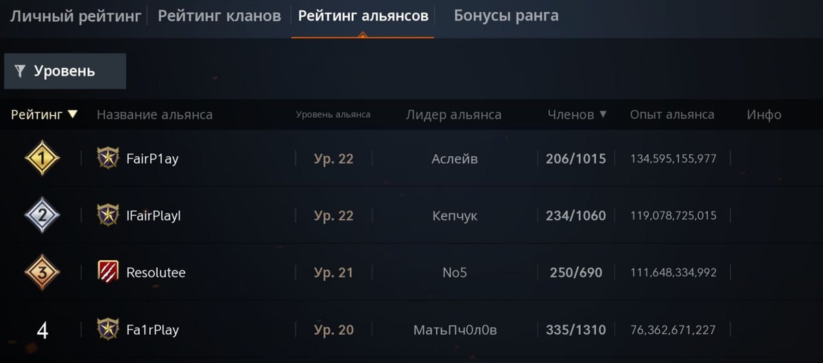 Топ-10 альянс по опыту на данный момент: 1. FairP1ay | Ур. 22 | 134,590,573,229 (кластер Зигхард) 2. IFairPlayI | Ур. 22 | 119,065,377,615 (кластер Леона) 3. Resolutee | Ур. 21 | 111,623,378,623 (кластер Эрика) 4. Fa1rPlay | Ур. 20 | 76,339,155,422 (кластер Барц) 5. FairPlay | Ур. 20 | 73,296,676,104 (кластер Эрика) 6. Absolutte | Ур. 20 | 71,479,099,746 (кластер Барц) 7. Resolute | Ур. 18 | 52,739,726,346 (кластер Леона) 8. ABSOLUT | Ур. 18 | 50,943,641,879 (кластер Зигхард) 9. WW | Ур. 18 | 48,681,432,137 (кластер Леона) 10. СДЕДА | Ур. 17 | 43,074,002,191 (кластер Зигхард)