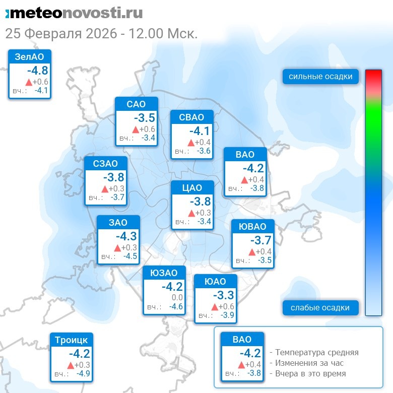 В 12:00 в Москве было от -5.2°C до -2.3°C, средняя температура -3.8°C #погода #Москва #зима #температура #25февраля #среда