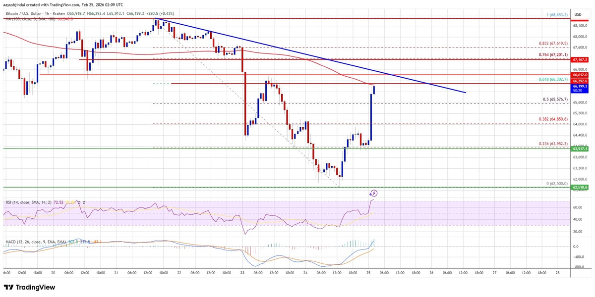 Биткойн не смог удержаться выше $65,000 и опустился до $62,500, но сейчас показывает признаки восстановления. Ключевые уровни сопротивления находятся у отметки $66,500, что является критической зоной для быков. Преодоление этих барьеров определит дальнейшее движение цены. 📊 Ключевые моменты: - 📈 Цена BTC торгуется ниже $66,500 и 100-часовой простой скользящей средней. - 📉 Формируется медвежья линия тренда с сопротивлением на уровне $66,600 (график BTC/USD от Kraken). - ➡️ Важные уровни сопротивления: $66,500, $66,600 и $67,200. - ⬅️ Основные уровни поддержки: $65,500, $65,000 и $62,500. - 📊 MACD набирает обороты в бычьей зоне, RSI выше 50. ⚠️ Риски: Если цена не поднимется выше $66,500, возможно дальнейшее снижение к $65,500 и далее к $62,500. Горизонт: краткосрочно