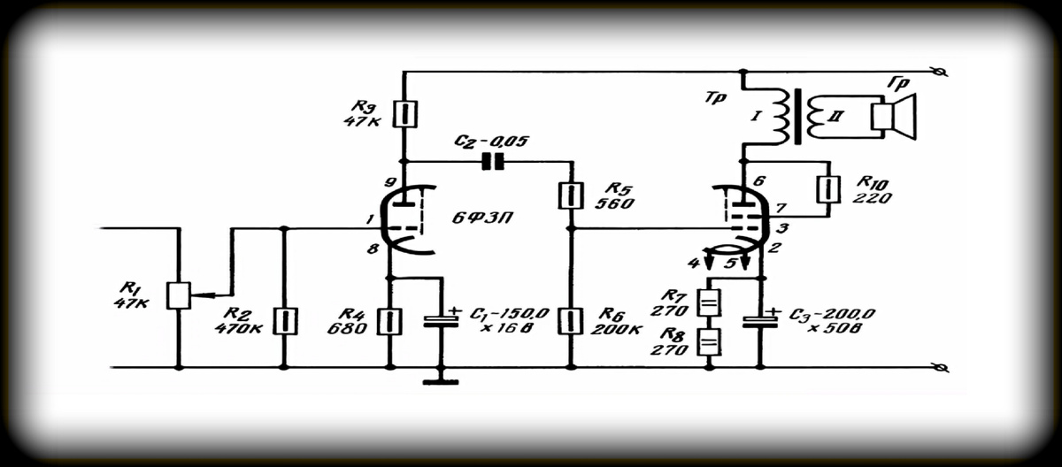 - Трансформатор Тр - согласует выход лампы с динамиком Гр;