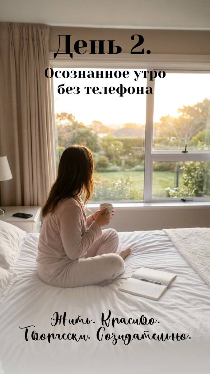 ✨ Практикум «Жить. Красиво. Творчески. Созидательно.» 🌿 Неделя 1: Возвращение к себе (Отношения с собой и телом) День 2️⃣. Осознанное утро без телефона 📱 Первые 30 минут после пробуждения не бери в руки телефон. Твоё энергетическое поле в это время подобно чистому листу — не позволяй чужим новостям рисовать на нём раньше, чем ты сам создашь свой узор. 📌 Рекомендация и напоминание: 1️⃣ Поделись с друзьями. 👥 Всегда помни: делиться важным — значит и свое окружение делать счастливым. 2️⃣ Этот практикум — не гонка. Это 30 дней возвращения домой, в самого себя. Иди в своём темпе. Пропускай дни, если нужно. Возвращайся. Здесь нет опозданий. 3️⃣ Главное — помни: Ты уже живёшь красиво. Мы просто учимся замечать это. 🌱 До встречи во втором дне. Он уже ждёт тебя.