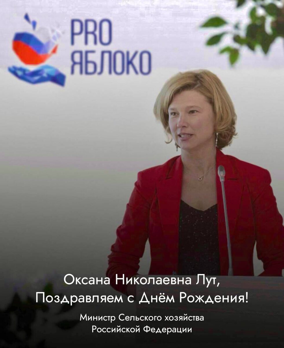 Сегодня команда PRO ЯБЛОКО поздравляет Министра сельского хозяйства Российской Федерации @mcx_ru Оксану Николаевну Лут с Днём рождения. Оксана Николаевна, Вы - человек редкого сочетания силы, интеллекта и искренней вовлечённости в дело. Под Вашим руководством сельское хозяйство звучит современно, уверенно и амбициозно. Сегодня отрасль развивается, обновляется, закладывает новые сады, внедряет технологии и расширяет горизонты. И профессиональное сообщество чувствует: за этими процессами стоит внимание к людям и глубокое понимание того, как важно поддерживать тех, кто работает на земле. Для садоводов особенно ценно видеть, что плодово-ягодное направление получает развитие и стратегическое значение. Сады - это инвестиция в десятилетия, и такая политика требует смелости и дальнего взгляда. Искренне восхищаемся Вашей энергией, масштабом мышления и умением принимать решения, которые работают на будущее. Желаем крепкого здоровья, внутренней силы и вдохновения для новых масштабных шагов в