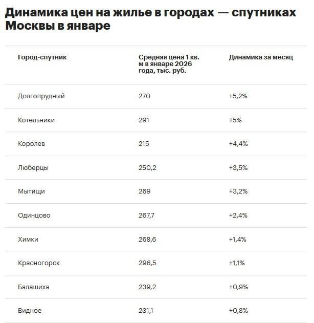 С начала 2026 года быстрее всего новостройки дорожают в Долгопрудном — в январе м² прибавил 5,2% и достиг 270 тыс. рублей. 🔵На втором месте — Котельники (+5% за месяц, до 291 тыс. руб.), на третьем — Королев (+4,4%, до 215 тыс. руб.). По итогам 2025 года максимальный рост цен в ближайшем Подмосковье показали Мытищи (+29%), Реутов (+26,9%) и Котельники (+24,1%).