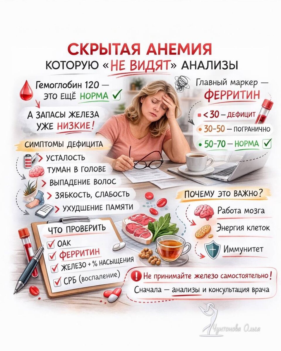 «Гемоглобин 120 — всё нормально». А сил нет, голова в тумане, волосы сыпятся. Важно понимать, что железодефицит начинается не с падения гемоглобина. Сначала организм тратит запасы — падает ферритин, и только потом снижается Hb. Поэтому при Hb 120–125 могут быть: • усталость • снижение концентрации • сонливость • выпадение волос • зябкость • тахикардия Ферритин — главный маркер скрытого дефицита. Да, 15–20 может быть «по норме», но клинически это часто уже уровень с симптомами. Ориентиры: < 30 — вероятный дефицит 30–50 — погранично 50–70 — у многих именно здесь возвращается энергия Железо нужно не только для крови, но и для работы мозга, митохондрий и синтеза нейромедиаторов. При дефиците мозг работает в режиме «энергосбережения». Что проверить: • ОАК • ферритин • сывороточное железо и % насыщения трансферрина • СРБ И главное — искать причину. Железо нельзя принимать «на всякий случай». Но и игнорировать симптомы при «нормальном» гемоглобине — ошибка. Если нет сил — проверьте фе