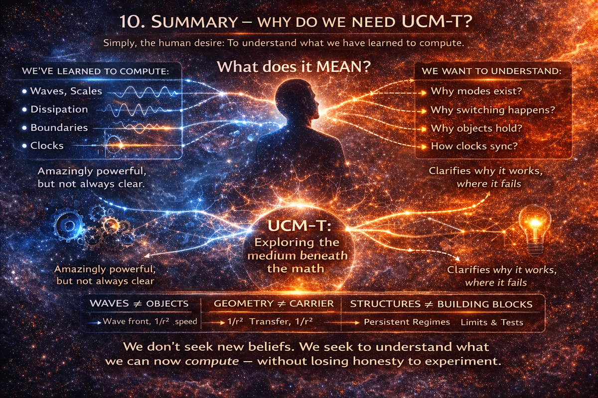 А чтобы понимать то, что мы уже научились считать. Мы живём в эпоху, когда человечество умеет невероятно много вычислять, моделировать, калибровать, предсказывать – и при этом часто не понимает, что именно оно делает. Не потому что “глупое”. А потому что язык расчёта и язык понимания – разные. UCM-T для нас – попытка построить каркас понимания, не разрушая каркас вычислений. Не “веру в среду”. И не “новую религию”. А один навык: уметь задавать правильные вопросы о том, что уже измерено и посчитано. Вот эта “памятка вопросов” – фактически итог всего цикла. 1) Это волна или объект-режим? 2) Что здесь геометрия, а что перенос? 3) Есть ли дисперсия? 4) Есть ли затухание и “память”? 5) Ест