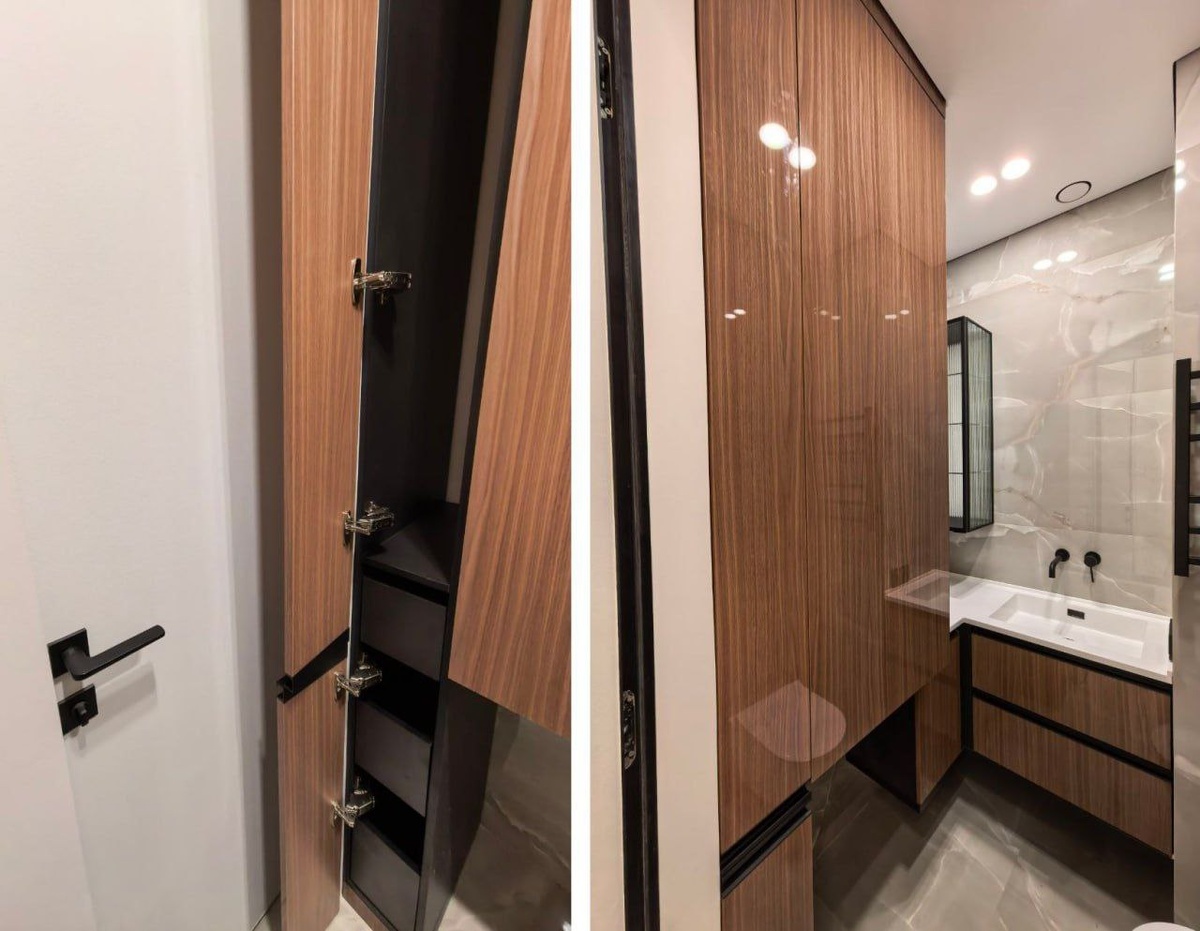 Отдельного внимания заслуживает не менее сложный санузел, многофункциональный при скромных размерах, в довольно смелом, но при этом гармоничном дизайне. В качестве фасада мы предложили Alvic Luxe глянец в древесном декоре, как более практичного в уходе, вместо пористой фактуры ЛДСП, имитирующей шпон. "Перчинки" в проектировании существенно добавили неправильно расположенные розетка и коммуникации под стиральную машину (на фото под нее пока пустует ниша под шкафом). Излишне выдвинутая вперед инсталяция с расположенным впритык полотенцесушителем - фасад просто не вставал по толщине между ними, и многие другие нюансы)), с которыми все же удалось справиться, изрядно поломав голову. В санузле продуманы системы хранения для различной бытовой химии, выдвижные корзины для белья, место под гладильную доску, полки, большие ящики в тумбе, вместительная угловая секция возле раковины. Изюминкой стал навесной шкаф из металлопрофиля с рифленым стеклом и подсветкой для средств ежедневного у