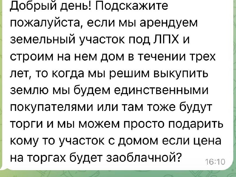 Чтобы выкупить землю опять будут торги? Это ж мы можем кому-то дом 🏠 подарить!» 😱😱😱 - вопрос подписчицы. ❗️«Конечно нет!» - отвечаем мы. На самом деле все ответы на вопросы насчет аренды, покупки и выкупа земельного участка у государства можно найти в Земельном Кодексе РФ. Это наш с вами главный документ. В ст., касающейся приобретения земельного участка без торгов, указано, что такое право есть у собственника здания / сооружения, расположенного на участке. То есть ЗК РФ говорит нам, что собственник дома может выкупить свой участок, если построил и зарегистрировал дом 🏠. ➡️При этом размер платы за землю регулируется уже местными распоряжениями. Обычно цена льготная и составляет 3%-60% от стоимости участка.
