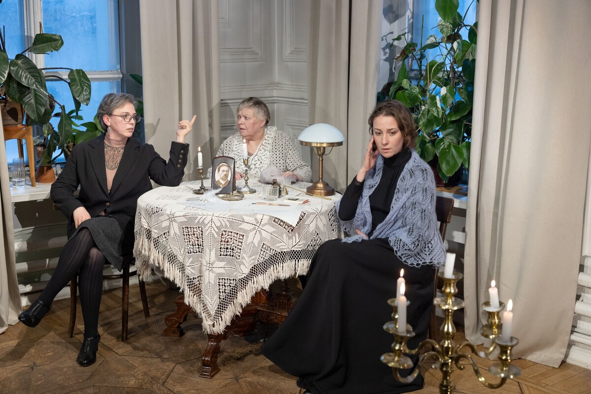 Драматург Ольга Погодина-Кузмина (в спектакле она выступает как автор идеи) сделала невозможное: дала слово тем, у кого его не было. Наташа, жена Андрея, которую муж называл «шершавым животным». Ее дочь Софочка, которая в старости осталась одна — с глазами ребенка, с лавочки у подъезда. И Лидия — выдуманная жена того самого Протопопова, с которым у Наташи был «романчик». Только вот Лидия живет в 1915-м, и она — из той же породы, что Маша и Ирина, изнеженный цветок дворянской оранжереи. Три женщины, три времени, три правды. И один стол, за которым им предстоит выяснить, кто из них «правее».