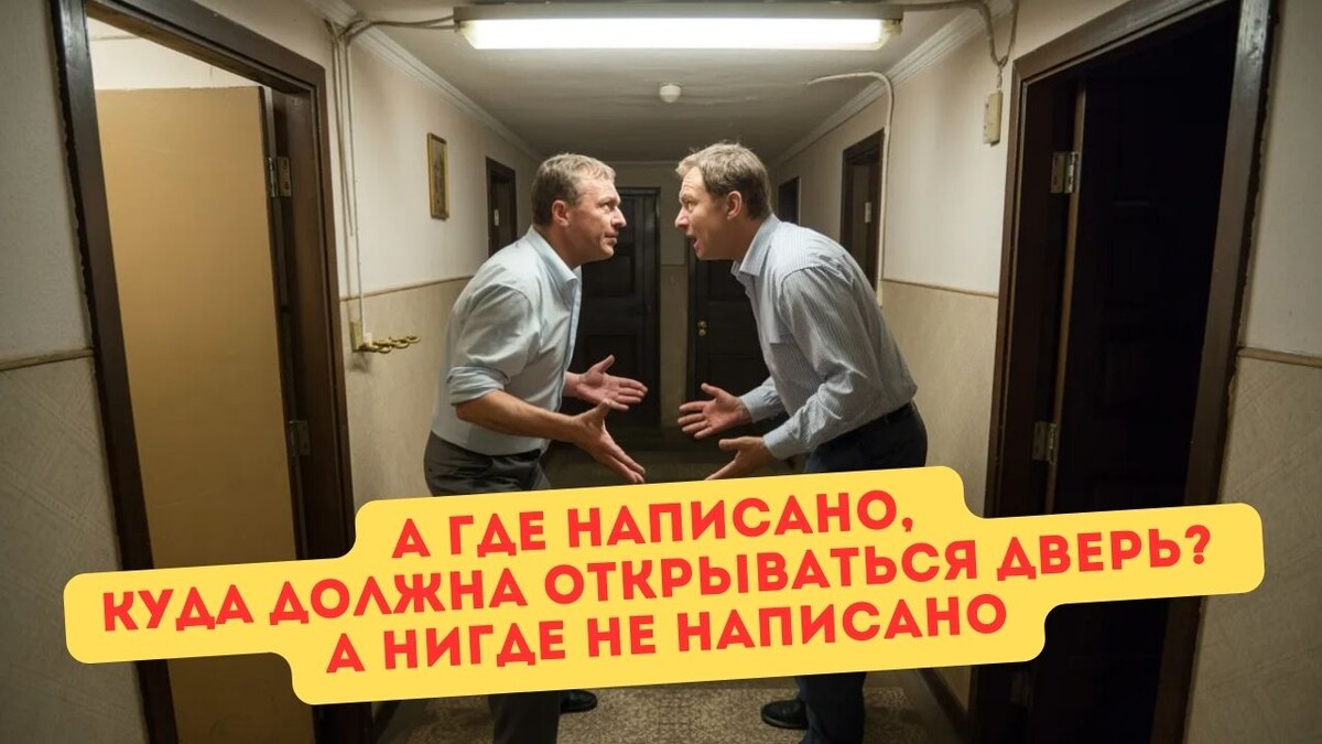 «Тамбур на две квартиры. Крошечный пятачок, где мы с соседом раньше жили мирно. Потому что двери у всех открывались вовнутрь. У всех — это значит во всём доме», — обратился ко мне один из читателей. История его такая: «Потом сосед затеял ремонт. И всё — мир кончился. Он поставил новую дверь с открыванием наружу. Теперь его «броня» перекрывает мне выход. Его дверь иногда бьётся о мою — когда моя уже приоткрыта. К тому же я рискую либо оказаться замурованным, либо получить удар металлом по голове. — А где написано, в какую сторону должна открываться дверь? Нигде не написано, — огрызается этот строитель.
