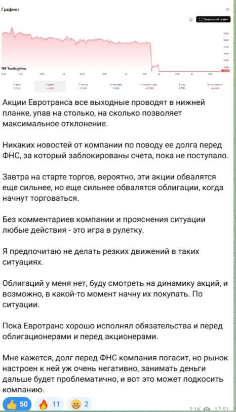 У меня есть акции Евротранса, облигаций нет, и я написал у себя в Телеграм-канале, что не планирую их продавать, а если сильно упадут - возможно, начну докупать. Также написал, что любые "резкие движения" в такой ситуации опасны. Написал также, что образовавшийся долг перед ФНС, вероятно, будет оперативно погашен, но бумаги, теоретически, должны все равно обвалиться, причем облигации обвалятся сильнее акций.