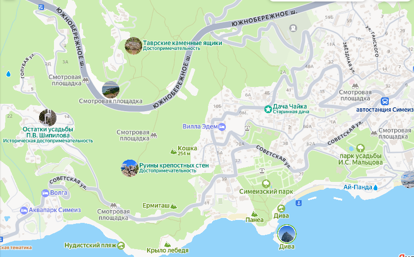 А вот дальше, если я верно определила по карте, расположен посёлок городского типа Кацивели:
