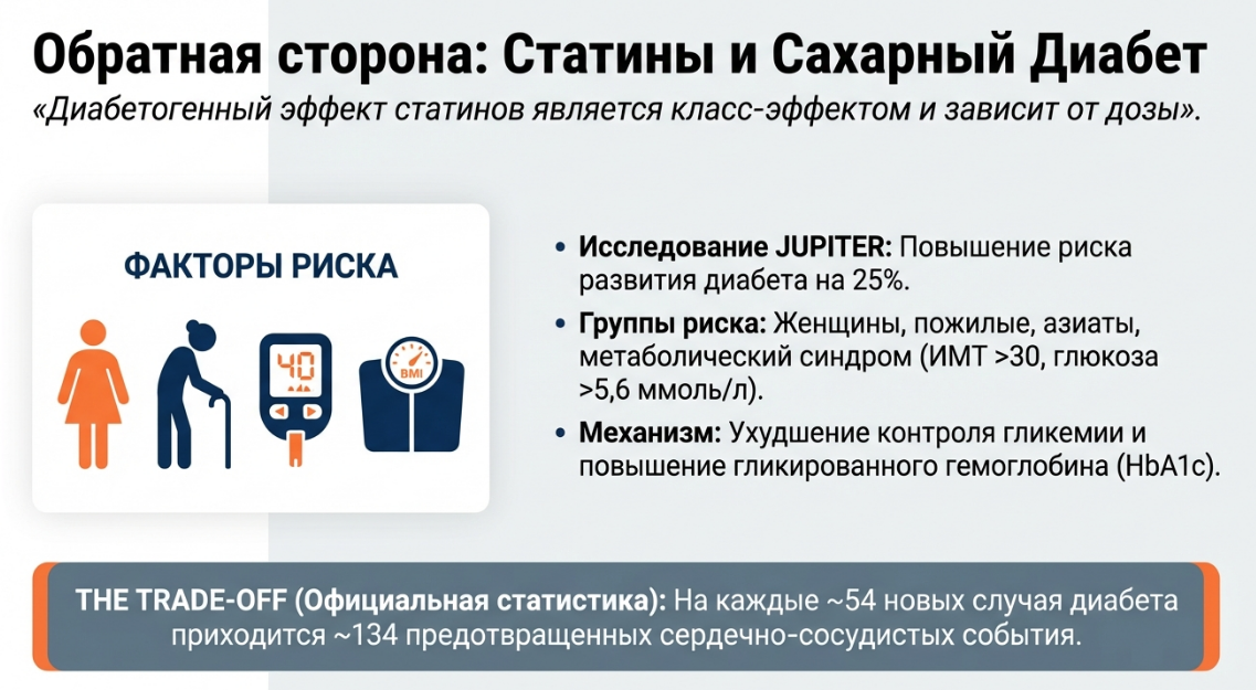 Связь между приемом статинов и риском развития сахарного диабета (СД) подтверждена результатами крупных рандомизированных клинических исследований и метаанализов. Это влияние характеризуется следующими ключевыми положениями: Риск развития новых случаев СД 2-го типа распределен неравномерно. Наиболее подвержены ему: Исследование JUPITER показало, что у пациентов, не имеющих факторов риска развития СД, терапия статинами не приводила к повышению вероятности заболевания. Метаанализ 13 исследований показал, что терапия статинами в среднем повышает относительный риск развития СД на 9%. Другие исследования указывают, что, согласно инструкциям к препаратам, это нежелательное явление встречается с частотой от 1% до 10% (у каждого сотого или каждого десятого пациента). Для развития одного нового случая СД 2-го типа необходимо лечить 167 пациентов высокими дозами статинов в течение 5 лет. Некоторые исследования (включая европейские и российские рекомендации) подчеркивают, что способность статинов