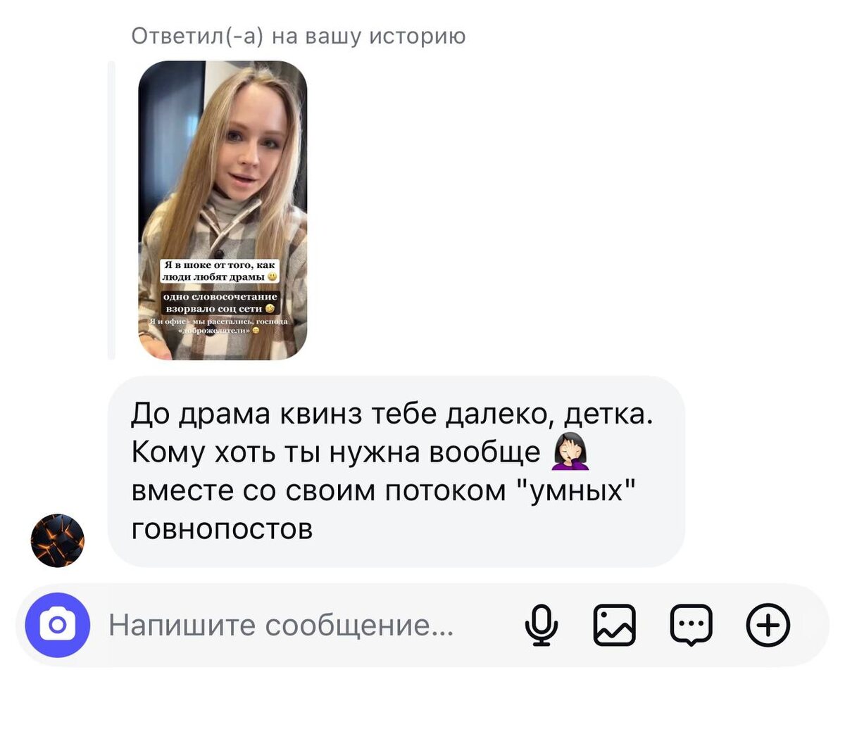 Когда начинаешь мыслить свободнее, пробуешь, ДЕЙСТВУЕШЬ и НЕ БОИШЬСЯ – сразу появляются те, кому эти опции недоступны))) Мне всегда интересно, что движет этими людьми?…Почему они так озлоблены на мир? И, самое главное, что им это даст, если я их просто блокирую. Тратить время на то, чтобы вступить в дискуссию – бред бредовый 🤤 Когда-то я писала пост о том, что агрессию всегда порождает страх. Думаю, что в данном случае, это страх - никогда не самореализоваться. И это, на мой взгляд, действительно, очень страшно. И грустно от того, что злость правит их миром, не давая сделать шаг на встречу своим целям. Даже в этом канале есть «озлобленные трусы», которые любят ставить на мои записи этот смайл: 🤮 И хоть бы кто-то мордашку свою показал 😁 Так нет, легче всего подкидывать 💩 без лица. Очень надеюсь, что большинство из вас не занимаются такими вещами. Это лишь говорит о пустоте, которая творится внутри человека.