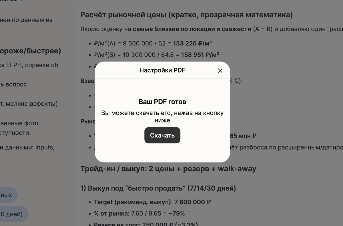 Сделано для тех, кто хочет успевать больше и при этом не терять в качестве. Сегодня сильные инвесткоманды ищут не просто “быстрее”, а умный баланс между скоростью и глубиной. Эта платформа помогает: — быстрее разбирать сделки — увереннее принимать решения — вести больший поток объектов — и не проседать по качеству анализа Что даёт платформа: 1️⃣ Поток сделок (deal flow) Быстрый отсев всего входящего потока и фокус на объектах, которые реально стоят внимания. 2️⃣ Аналитика Оценка, аналоги, рыночный контекст — автоматически, без ручной сборки “по кускам”. 3️⃣ Оценка рисков Сценарии чувствительности и стресс-проверка по ключевым параметрам (ставки, сроки, заполняемость, цена входа и т.д.). 4️⃣ Коммуникация с инвесторами / руководством Готовые материалы по итогам анализа: понятные выводы, ключевые риски, рекомендации. 5️⃣ Единый стандарт Одна логика и одна методика для каждого объекта — без “кто как посчитал”. То, на что раньше по одной сделке уходили недели, теперь можно сделать за минуты