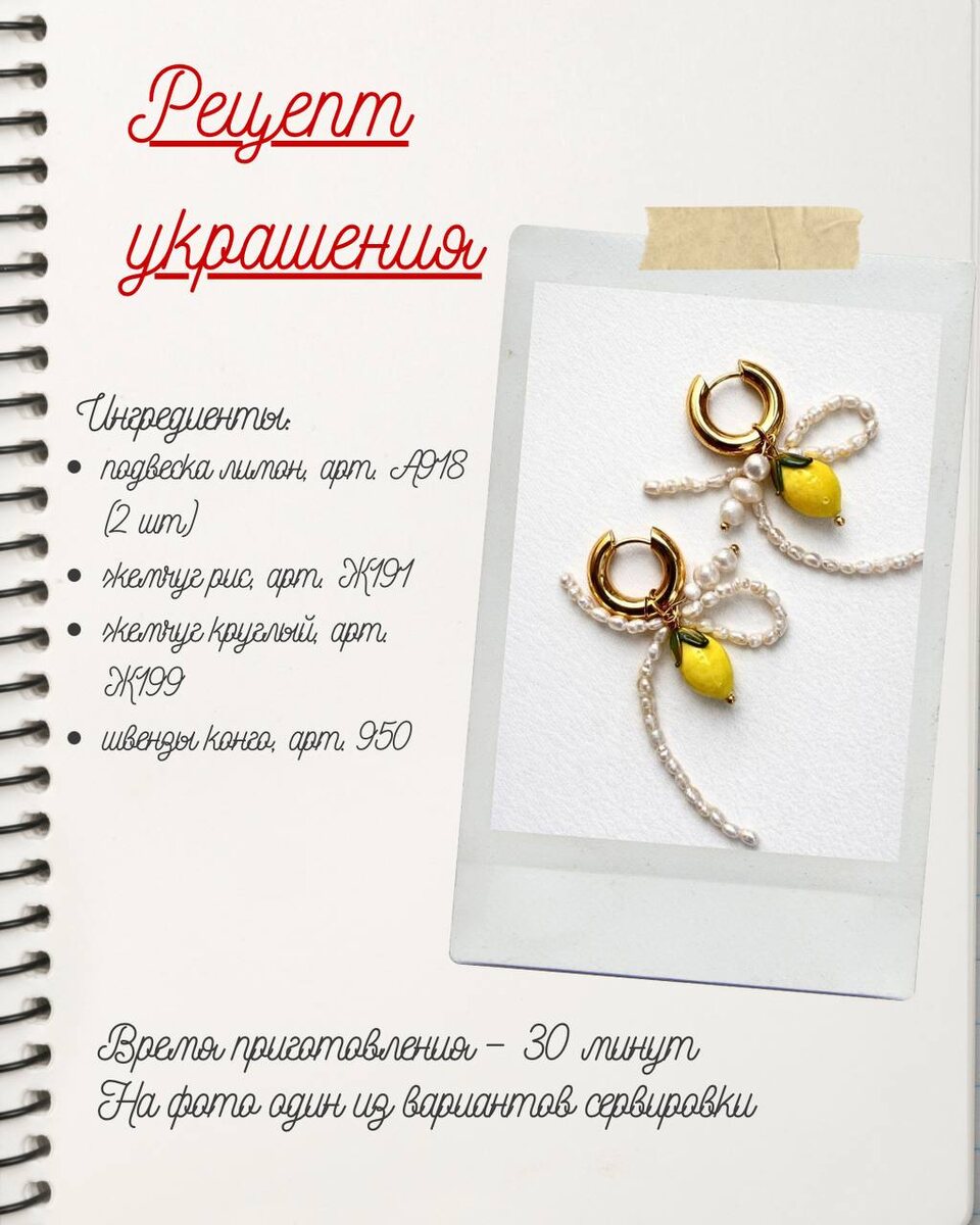Сохраняйте рецепт ❤️ Продолжаем нашу рубрику и сегодня приготовим серьги с жемчугом и яркими акцентами 🍋 Живые, подвижные, с игривым настроением. Такие серьги сразу добавляют образу света и деталей, которые хочется рассматривать. Они хорошо смотрятся и в повседневных луках, и как акцент в более собранных образах. Рецепт украшения Основные ингредиенты — Подвеска лимон, арт. А918 (2 шт) — Жемчуг рис, арт. Ж191 — Жемчуг круглый, арт. Ж199 — Швензы конго, арт. 950 Расходники — Пины, арт. М212 — Мононить прозрачная, арт. Ц055 — Кримпы зажимные, арт. М610 — Бейл кольцо, арт. К505 (2 шт) Приготовление Нанизываем на мононить жемчужины в форме риса и фиксируем отрезки, аккуратно зажимая их парой кримпов. К бейлам крепим декоративные лимончики. Далее складываем петельки из жемчужных отрезков и помещаем их в ушко бейла. На пины нанизываем круглые жемчужины, делаем французскую скрутку и также крепим к бейлу. Готовые бейлы надеваем на швензы и собираем серьги. Готово ✨ Украшение получается лёгким,