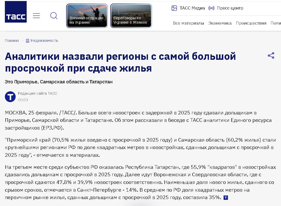 Зона стихийного бедствия. Предупреждение МЧС, простите... те сегодня на корпоративе, их временно заменяет ТАСС Аналитики назвали регионы с самой большой просрочкой при сдаче жилья Больше всего новостроек с задержкой в 2025 году сдавали дольщикам в Приморье, Самарской области и Татарстане. Об этом рассказали в беседе с ТАСС аналитики Единого ресурса застройщиков (ЕРЗ РФ). "Приморский край (70,5% жилья введено с просрочкой в 2025 году) и Самарская область (60,2% жилья) стали крупнейшими регионами РФ по доле квадратных метров в новостройках, сданных дольщикам с просрочкой в 2025 году", - отмечается в материалах. На третьем месте среди субъектов РФ оказалась Республика Татарстан, где 55,9% "квадратов" в новостройках сдавались дольщикам с просрочкой в 2025 году. Далее идут Воронежская и Свердловская области, где с просрочкой сдаются 47,8% и 39,9% новостроек соответственно. В среднем по РФ доля квадратных метров на первичном рынке жилья, сданных дольщикам с просрочкой в 2025 году, составила