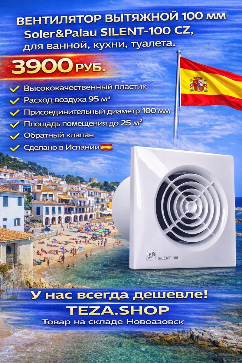 👉 Спеццена — всего 3900 руб! Идеальное решение для ванной, кухни или туалета — тихая и эффективная вентиляция каждый день 👌 Преимущества: 🔥 Прочный корпус из высококачественного пластика 🔥 Производительность — 95 м³/ч 🔥 Присоединительный диаметр — 100 мм 🔥 Подходит для помещений до 25 м² 🔥 Обратный клапан — защита от обратной тяги 🔥 Производство — Испания🇪🇸🇪🇸🇪🇸 🍬 У нас всегда дешевле! 🗺 TEZA.SHOP 🛒 В наличии на складе (Новоазовск) 📞 +7 (949) 301-08-41