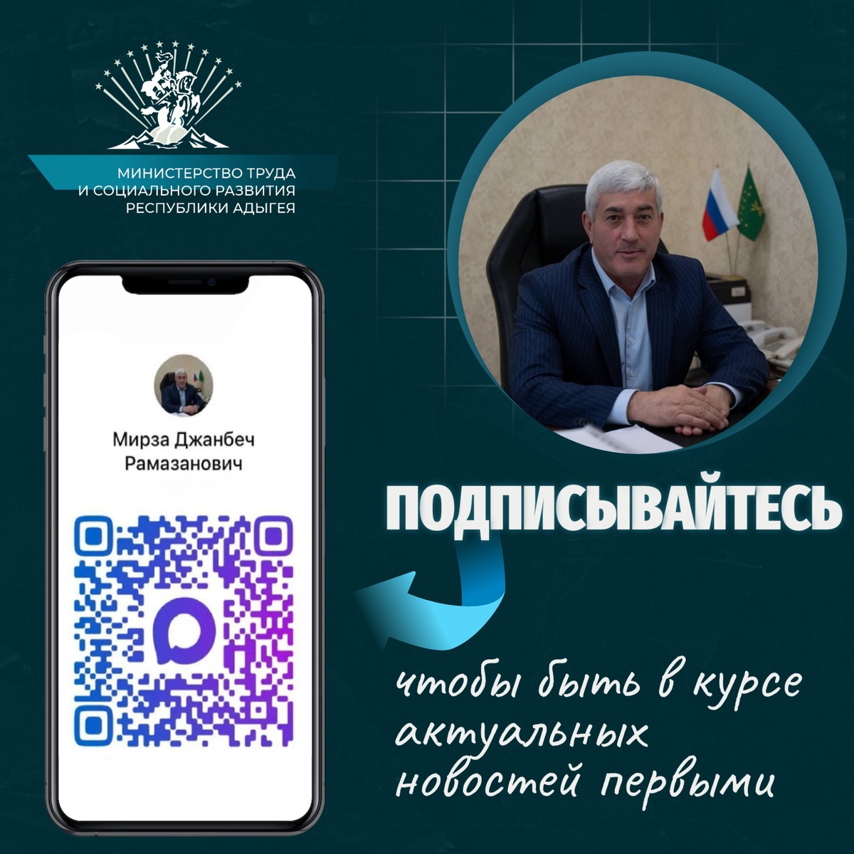Дорогие друзья! Сообщаем важную новость: Министр труда и социального развития Республики Адыгея Джанбеч Мирза запустил свой официальный канал в национальном мессенджере МАХ Это новая площадка для открытого, честного и прямого диалога с жителями республики. Подписывайтесь, чтобы быть в курсе актуальных новостей первыми! Вместе сделаем социальную сферу Адыгеи доступной, понятной и открытой для каждого! Ссылка на канал: https://clck.ru/3Rqbps