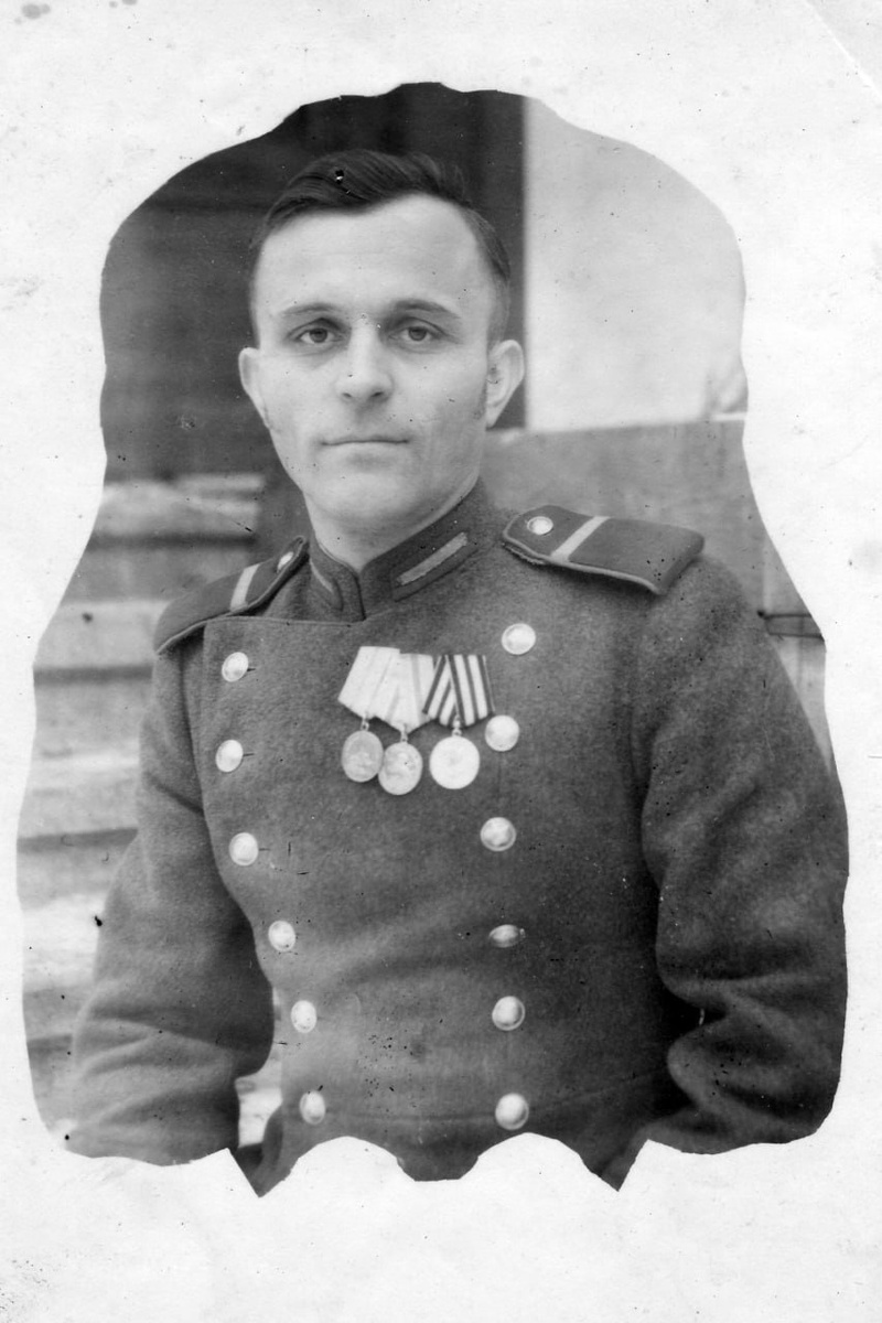 У ефрейтора медали - "За оборону Ленинграда", "За оборону Советского Заполярья" и "За победу над Германией". На обороте - "На память любимому другу Мурику! От Вани Курышева, возьмёшь, посмотришь и вспомнишь. 08.02.46 г. 22 час 18 мин, Курышев". Источник: отсканированная фотография из личной коллекции. #фото #ефрейтор #ПВ #Пограничные_войска #НКВД