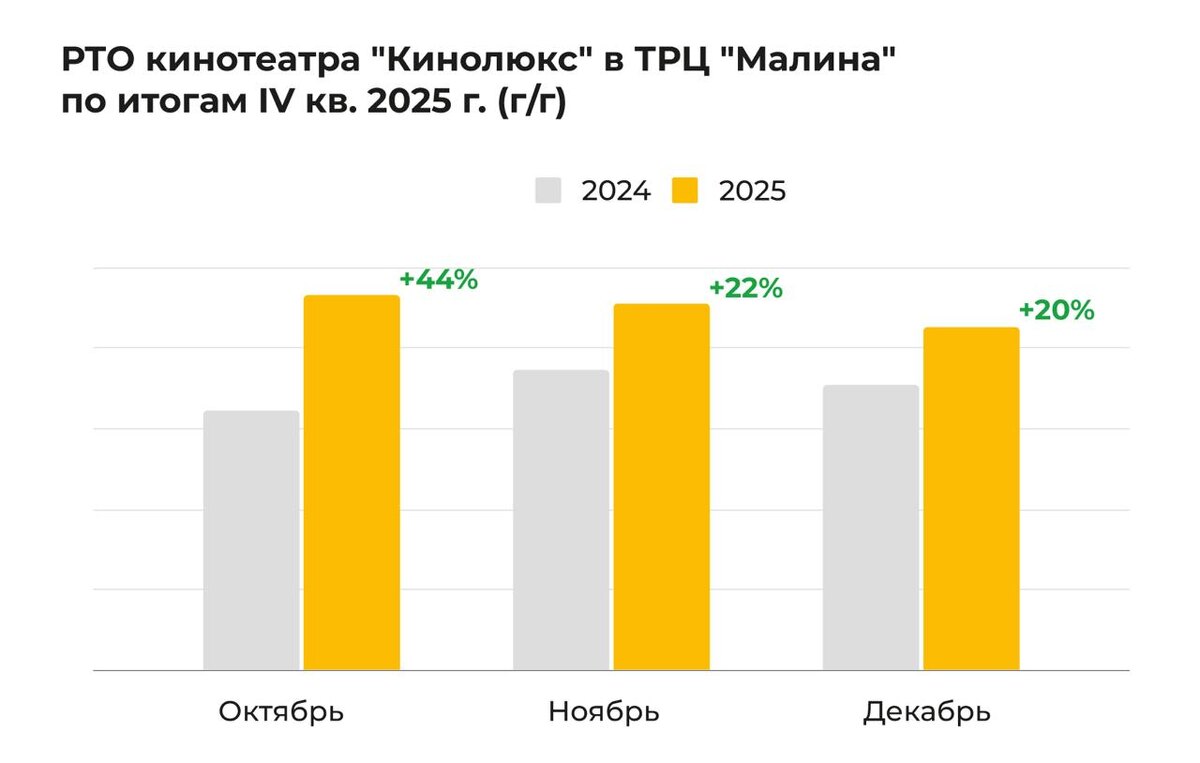 2025 г. За IV кв. 2025 г. российские кинотеатры собрали 10,8 млрд ₽ — это +23% по отношению к аналогичному периоду 2024 г. Показатели кинотеатра в ТРЦ «Малина» («Активо восемнадцать») также растут. Розничный товарооборот (РТО) вырос на 28% в IV кв. 2025 г. (г/г). Прирост РТО связан с выходом большого количества успешных российских фильмов и увеличением стоимости билетов в кино. #A18