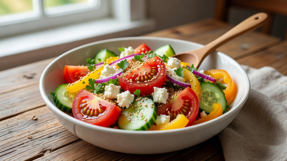 8. Сверху посыпаю обжаренными семенами кунжута. Кунжут — маленькая деталь, которая меняет всё: добавляет лёгкий ореховый хруст и превращает обычный овощной салат в нечто изысканное. Обжарить кунжут просто — на сухой сковороде минуту-две, пока зёрнышки не станут золотистыми и не начнут потрескивать.
