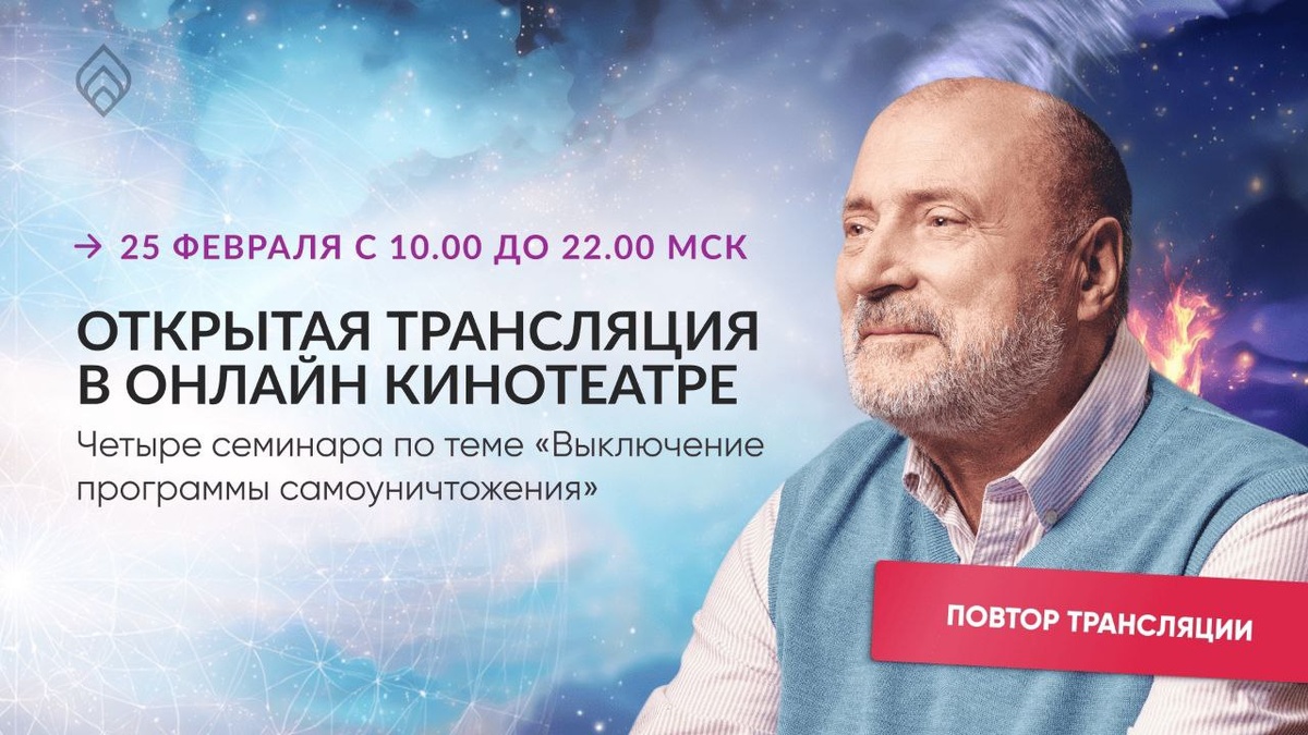 🩵 Любимые читатели, отличная новость для вас! По вашим многочисленным просьбам сегодня мы повторяем бесплатную 12-часовую трансляцию на RuTube. Мы вытащили из архивов настоящие бриллианты знаний, чтобы вы смогли перезагрузить свое состояние. Присоединяйтесь и смотрите в любое время 25 февраля с 10:00 до 22:00 мск. Кроме легендарных семинаров, ответов на вопросы и фрагментов лекций, мы добавили 2 новых видео! ✔ Советы Сергея Николаевича для тех, кто впервые идет на курс "Выключение программы самоуничтожения": подводные камни и ошибки новичков, и как правильно настроиться, чтобы курс прошел максимально эффективно ✔ Прохождение курса во время поста: глубинный смысл поста и какую нужно поставить перед собой цель для реальных перемен. Заходите в любой момент, чтобы зарядиться и забрать свое. Вход открыт для всех! 🎦 ПОДКЛЮЧИТЬСЯ: