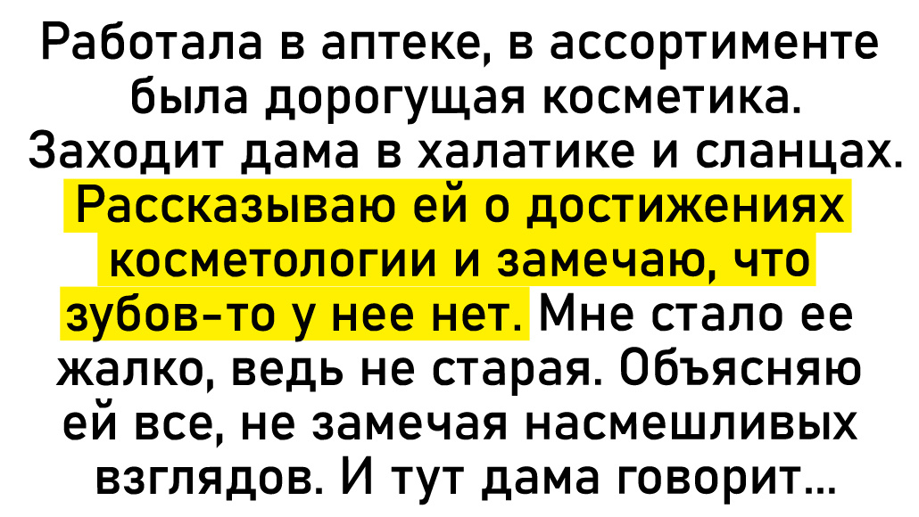 Работала в аптеке, в ассортименте была дорогущая косметика. Заходит дама в халатике и сланцах. Рассказываю ей о достижениях косметологии и замечаю, что зубов-то у неe нет. Мне стало ее жалко, ведь не старая. Объясняю ей все, не замечая насмешливых взглядов. И тут дама говорит: «Я возьму все». Оказалось, она приехала с золотого прииска Бодайбо в челюстно-лицевую клинику. Вот так я навсегда отучилась судить по внешнему виду о людях! © Eengaly / Pikabu