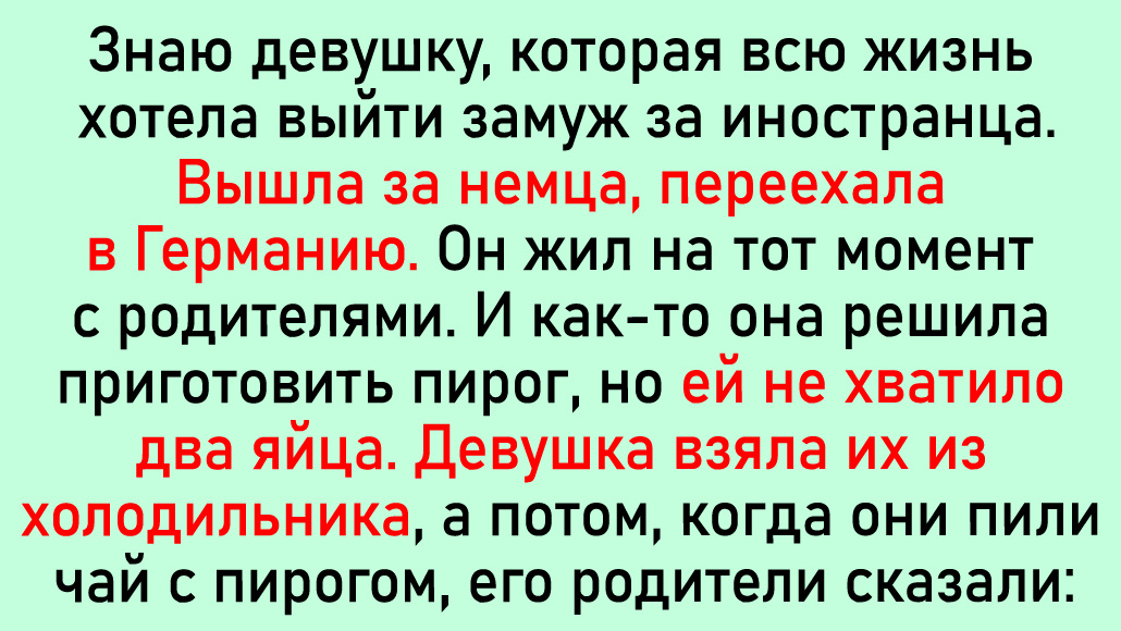 Знаю девушку, которая всю жизнь хотела выйти замуж за иностранца. Вышла за немца, переехала в Германию. Он жил на тот момент с родителями. И как-то она решила приготовить пирог, но ей не хватило два яйца. Девушка взяла их из холодильника, а потом, когда они пили чай с пирогом, его родители сказали: «Спасибо, конечно, но кто тебе разрешал брать наши яйца?» В итоге они развелись, потому что ее парень тоже оказался очень жадным.