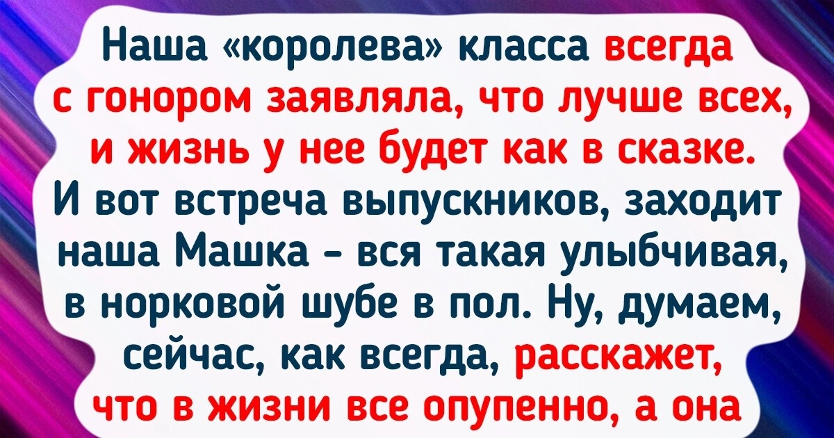 Наша «королева» класса всегда с гонором заявляла, что лучше всех, и жизнь у нее будет как в сказке. И вот встреча выпускников, заходит наша Машка — вся такая улыбчивая, в норковой шубе в пол. Ну, думаем, сейчас, как всегда, расскажет, что в жизни все опупенно, а она говорит, что не замужем, без детей, правда работает в банке начальником, ездит в путешествия часто в командировки, занимается йогой и не ест мясо. Мы с девками переглянулись — получается ей к сорока, а у нее ничего за душой нет. Какой смысл в норковой шубе и карьере, если ты одна? А потом мы от знакомой узнали, что она уже лет десять в отношениях с женатым мужиком. Он ей и карьеру «построил», и квартиру купил, и все оплачивает. Вот такая жизнь «как в сказке».