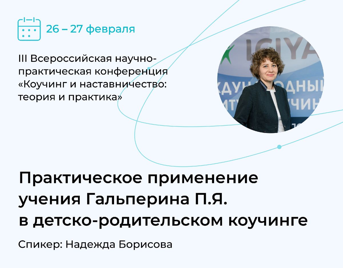 Завтра, 26 февраля директор нашего Института Надежда Борисова будет выступать спикером на III Всероссийской онлайн-конференции «Коучинг и наставничество: теория и практика». Время выступления: 14.50 -15.20 Тема выступления: "Практическое применение учения Гальперина П.Я. в детско-родительском коучинге" Надежда расскажет про: