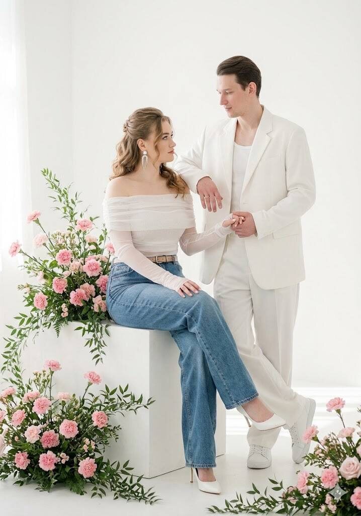 Сохрани внешность 1:1. Молодая девушка, в высоких широких длинных джинсах с кожаным тонким ремешком и белой кофте в несколько слоев из прозрачной ткани с открытыми плечами и длинными рукавами через палец, сидит в три четверти на белом кубе, одна рука держит руку мужчины, а другая рука облокочена на куб. Волосы волнистые распущены, а поверх распущенных часть волос приподнято сверху и завязано сзади, создавая объем. Крупные длинные серебряные серьги, естественный макияж. Рядом стоит в меру накаченный мужчина в белом оверсайз брючном костюме с белой майкой под пиджаком. На ногах у него белые кроссовки, а у девушки белые остроносые туфли. Вокруг и у ног — густые композиции из розовых гвоздик и пышной зелени, растения спускаются каскадом по переднему плану. Минималистичная белая студия, высокоключевой мягкий естественный свет слева, лёгкая контровая подсветка, воздушная атмосфера, нежные пастельные тона, плавные тени, мягкая глубина резкости. Фотореализм высокого разрешения, тонкая ретушь, кинематографичная композиция, объектив 85mm, f/1.8, мягкое боке, естественная текстура кожи, спокойное теплое настроение. Негатив: без текста, логотипов, шумных элементов, резких теней, искажения пропорций.