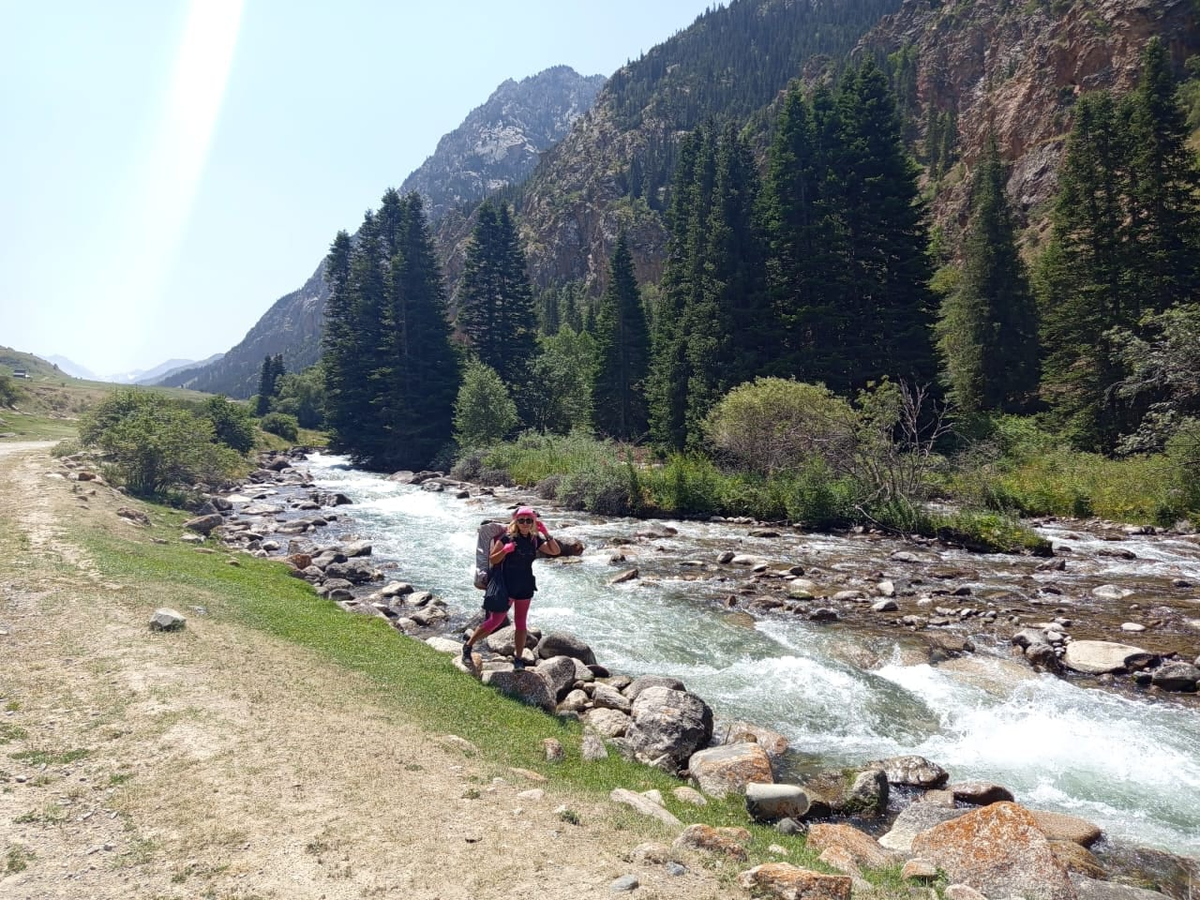 День начался довольно рано, встали по будильнику. Винни откатил сломанную телегу к гостевому дому и мы продолжили путешествие по Беш-Ташу с двумя большими рюкзаками. В отличие от предыдущих двух дней на дороге оказалось гораздо больше машин, и все они направлялись вглубь заповедника. Некоторые останавливались, чтобы подвезти, но большинство из них всё же было переполнено. И тут мы поняли: всё дело в субботе, люди большими семьями выбираются из города на пикники повыше в горы, где есть хоть какая-то прохлада. С первых километров пути Беш-Таш вновь начал покорять наши сердца своими фантастическими пейзажами и разнообразием ландшафтов: чистейшая река, суровые скалы, яркие, живописнейшие лужайки, огромные горы вдали, и ели, высоченные ели. И чем дальше мы шли и поднимались всё выше и выше, тем виды становились более сказочными. Иногда картинка вокруг напоминала кадры из фильма "В диких условиях", и будто погружала в атмосферу любимого кино. В какой-то момент на берегу реки стали появлят