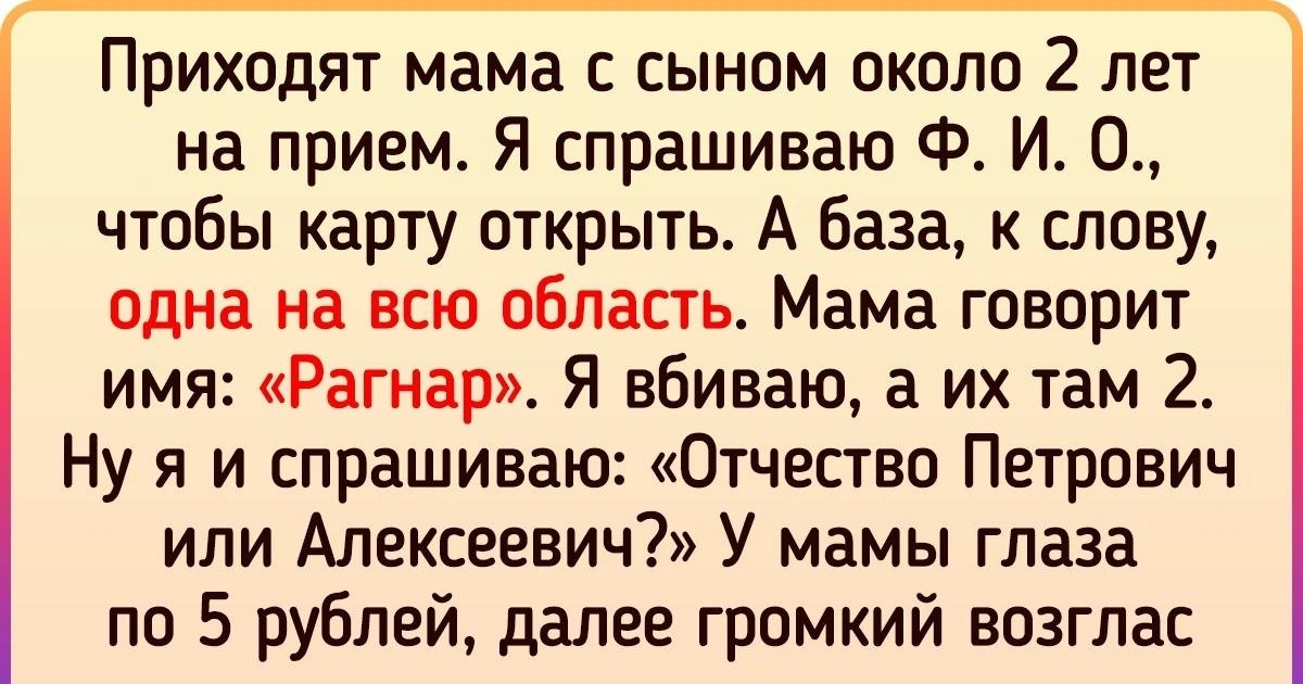 “На приеме у врача мама назвала сына Рагнар. В базе оказалось сразу два таких ребенка. Мама была в шоке, что ее идея оказалась не такой уж уникальной.”