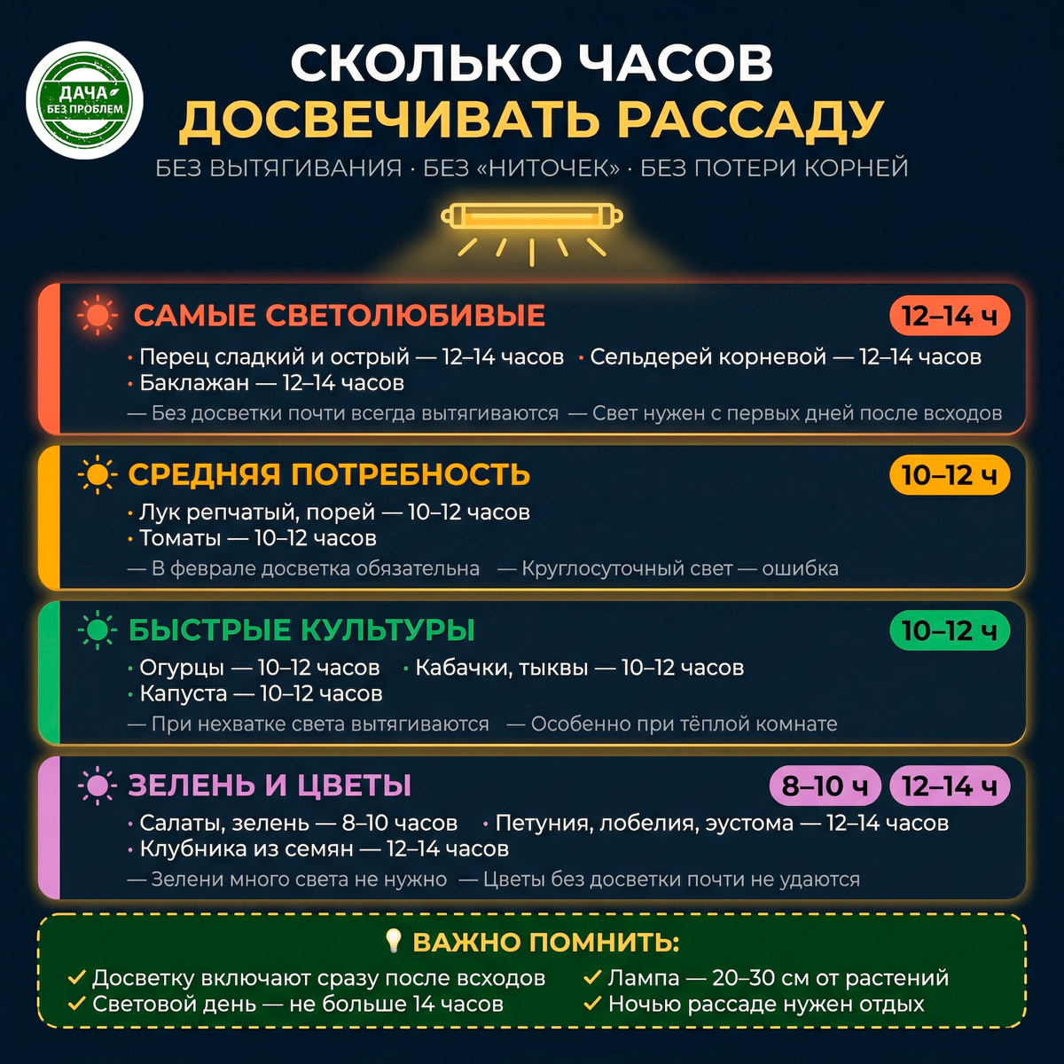 Самая частая проблема рассады, посеянной в феврале и марте - это вытягивание. Всходы стоят тонкие, бледные, стебли клонятся к окну, а междоузлия становятся длинными, как удочки. Такие растения тратят все силы на рост ввысь, забывая наращивать корни. Причина банальна: дефицит света. Даже на самом солнечном южном окне в средней полосе естественного освещения сейчас катастрофически мало. Сколько света реально нужно? Растениям не важно, светит солнце за окном или лампа над головой. Им важна продолжительность светового дня и интенсивность излучения. Мы составили для вас удобную таблицу-шпаргалку (смотрите в галерее/картинке ниже), где указаны оптимальные часы досветки для томатов, перцев и цветов на разных стадиях роста. Главные правила досветки: 1. Первые 3-5 дней (круглосуточно) Сразу после появления петелек всходов сеянцам нужен максимальный стресс светом. Включите лампу на 24 часа в сутки на первые 3-5 дней. Это даст мощный старт и предотвратит самое первое, критическое вытягивание подс